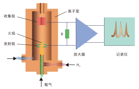 氫火焰離子化檢測器(FID),它是典型的破壞性、質(zhì)量型檢測器、是以氫氣和空氣燃燒生成的火焰為能源,當(dāng)有機化合物進入以氫氣和氧氣燃燒的火焰,在高溫下產(chǎn)生化學(xué)電離,電離產(chǎn)生比基流高幾個數(shù)量級的離子,在高壓電場的定向作用下,形成離子流,微弱的離子流經(jīng)過高阻放大,成為與進入火焰的有機化合物量成正比的電信號,因此可以根據(jù)信號的大小對有機物進行定量分析。