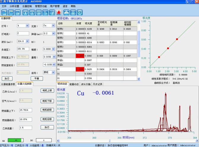 樣品測(cè)試:于原子吸收光譜儀波長(zhǎng)324.7nm處,使用空氣-乙炔火焰,以水調(diào)零,測(cè)量試液的吸光度,減去隨同試料的空白試驗(yàn)溶液的吸光度,從工作曲線上查出相應(yīng)的銅濃度