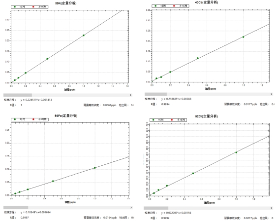 冷焰模式下,繪制各元素0,0.05,0.1,0.2,0.5,1.0μg/L系列濃度標液工作曲線,39K、40Ca、56Fe等同位素的線性相關(guān)系數(shù)r均大于0.999,背景等效濃度為0.0023μg/L~0.0217μg/L。