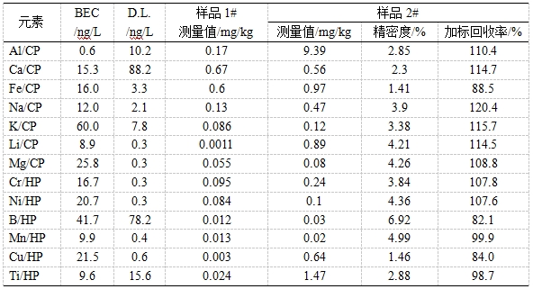 參考《GB/T 32650-2016 電感耦合等離子體質(zhì)譜法檢測石英砂中痕量元素》進行樣品前處理。利用冷焰模式及標準模式對樣品進行測試,考察背景等效濃度(BEC)、方法檢出限(D.L.)、加標回收率、精密度。背景等效濃度在0.6ng/L~60.0ng/L之間,方法檢出限在0.3ng/L~88.2ng/L之間,加標回收率在82.1%~120.4%之間,精密度在1.41%~6.92%之間。