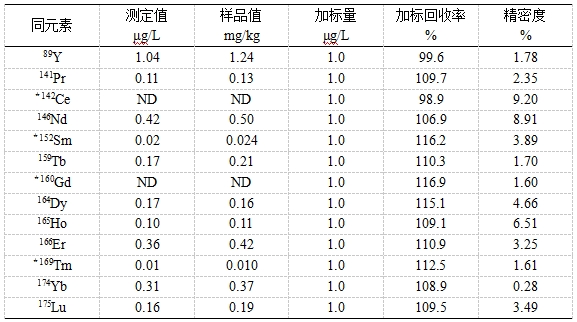 油田稀土示蹤劑主要用來考察油田井間的導通性,具有無放射性、安全穩(wěn)定、用量少、分析精度高等特點。將所得油田水樣搖勻過濾,稀硝酸稀釋一定倍數,以內標法校正樣品基體對待測同位素影響,考察Y、La、Ce等15種稀土示蹤劑的檢出限、精密度(以RSD表示)、加標回收率。發(fā)現檢出限為0.10~2.09ng/L;樣品1#的精密度為0.61%~3.25%;樣品2#中各元素加標回收率為93.1%~114.3%,精密度為0.85%~2.66%。