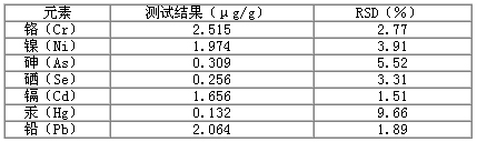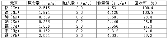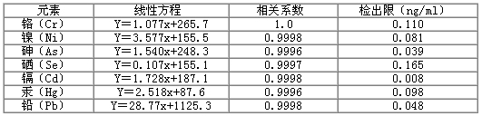 Hg標液單獨為一組。Cr 、Ni 、As 、Se 、Cd 和Pb 標液用各元素10μg/mL的標液稀釋至所需濃度。配制Hg標液時加入0.1mL 20 μg/mL金標準溶液。分析結果(表2)顯示,這7種元素的線性方程的相關系數為0.9996~1.000 ,檢出限為0.008~0.165ng/mL。