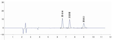 圖3 苯甲酸、山梨酸、糖精鈉液相色譜圖