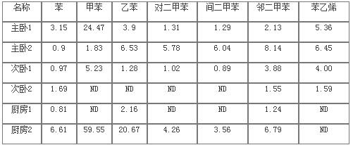 在剛裝修完的兩套住宅的三處不同地點(diǎn)進(jìn)行取樣并分析7種苯系物的含量,測(cè)試結(jié)果見(jiàn)表7。