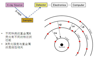 X射線熒光光譜技術(shù)(XRF)的原理見圖3所示,可以直接檢測(cè)固體或液體樣品中ppm量級(jí)的元素成分。采用富集后再檢測(cè)的辦法,使得XRF技術(shù)對(duì)空氣顆粒物中的重金屬成分的檢測(cè)限優(yōu)于0.001ug/m3。而常規(guī)實(shí)驗(yàn)室的檢測(cè)技術(shù),由于預(yù)處理消解過程中需要將微克量級(jí)的樣品溶解到幾十克的液體中,而使得濃度被稀釋百萬倍,從而多數(shù)儀器(譬如ICP-AES、或原子吸收光譜儀)無法檢出元素含量低于10ug/m3量級(jí)的空氣顆粒物樣品。