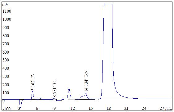 準確稱取0.2g(精確至0.0001g)試樣,采用氧彈燃燒后冷卻定容,經(jīng)0.22μm的水系濾膜過濾后上機得到測試譜圖如下圖2、圖3所示。