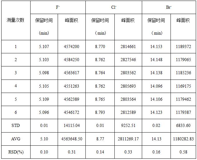 取2.0μg/mL F-、Cl-、Br-混合標準標準溶液重復(fù)進樣6次,考察保留時間和峰面積的重復(fù)性,詳見圖4;其中保留時間(tR)相對偏差在0.10%-0.16%之間,峰面積(S)的相對標準偏差在0.38%~0.53%之間,重復(fù)性結(jié)果詳見表1。