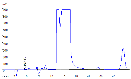 將大米、茶葉試樣分別粉粹后過篩,各稱取0.25g(精確至0.0001g),于氧彈燃燒儀進(jìn)行燃燒,冷卻后定容,經(jīng)0.22μm的水系濾膜過濾后上機(jī)得到樣品譜圖,如下圖3、圖4所示;食用油樣品直接稱重后進(jìn)行氧彈燃燒,測試得到的譜圖如圖5所示;生活飲用水直接上機(jī)后得到樣品譜圖詳見圖6。其中大米、茶葉、食用油中氟離子的測定結(jié)果均低于方法檢出限,同時對4種試樣進(jìn)行了加標(biāo)處理,加標(biāo)回收率在95.6%~102.3%之間。測試數(shù)據(jù)詳見表2。