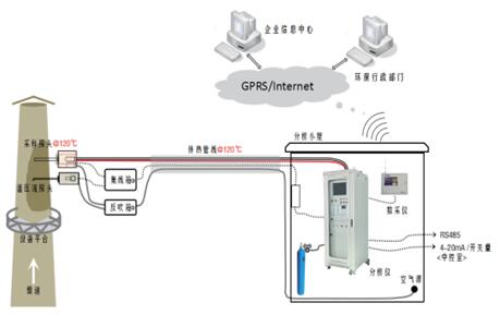 采樣探頭安裝于企業(yè)廢氣排口,排口被測廢氣被負壓抽泵抽取進入采樣探頭探桿(不加熱),經(jīng)過陶瓷濾芯進入伴熱管線(伴熱溫度可設置),樣氣在伴熱管中繼續(xù)傳輸至預處理系統(tǒng),在預處理系統(tǒng)經(jīng)過二級過濾和分流后按照一定流量送至在線氣相色譜儀(GC-FID)。在線氣相色譜儀控制內置自動取樣平面十通閥和定量環(huán)系統(tǒng)取1mL的被測樣氣,借助載氣送入色譜柱分離和FID做定性、定量分析。分析結果通過工控機保存,并和排氣筒監(jiān)測排放參數(shù)一起通過數(shù)采儀送至環(huán)保監(jiān)控平臺。