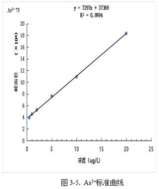 圖4為5.0μg/L混和標準溶液色譜圖,以各形態(tài)峰附近基線處的3倍信噪比(S/N)峰高對應的濃度作為檢出限,AsC、As3+、DMA、MMA、As5+分別為0.078μg/L、0.10μg/L、0.11μg/L、0.13μg/L、0.16μg/L。