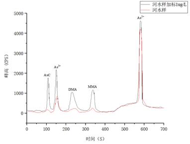河水樣品及加標1μg/L的測試結(jié)果詳見表4,樣品及加標后砷形態(tài)疊加譜圖如圖5所示。