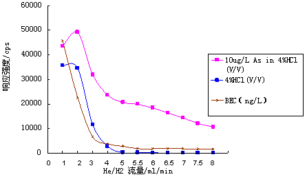 儀器首先在標(biāo)準(zhǔn)模式下進(jìn)行參數(shù)優(yōu)化(利用10μg·L-1的Li、Co、In、U、Ce調(diào)諧液對儀器工作參數(shù)進(jìn)行調(diào)節(jié),使儀器靈敏度高,同時氧化物及雙電荷產(chǎn)率小于3%);再開啟He/H2碰撞反應(yīng)氣,逐步增大He/H2流量,測試超純水、4%HCl及10μg·L-1 As(4%HCl介質(zhì))在75amu處的響應(yīng)信號,計算其背景等效濃度(詳細(xì)數(shù)據(jù)見表1及圖1);并利用As標(biāo)液進(jìn)一步優(yōu)化He/H2流量,得到儀器工作參數(shù)如表2所示。