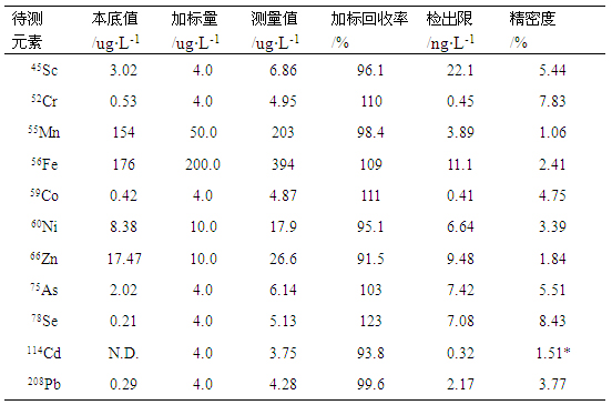 在儀器優(yōu)化工作參數(shù)條件下,對樣品溶液及加標(biāo)樣液進(jìn)行測試,計算其加標(biāo)回收率;對樣品空白溶液平行測定7次,以三倍空白信號標(biāo)準(zhǔn)偏差/靈敏度對應(yīng)的濃度為檢出限;同時對樣品溶液平行測定11次(間隔2min),計算其相對標(biāo)準(zhǔn)偏差,考察精密度,數(shù)據(jù)見表4。各元素檢出限在0.41-22.07ng/L之間,加標(biāo)回收率在93.82%-123.10%之間,精密度在1.06%-8.43%之間。