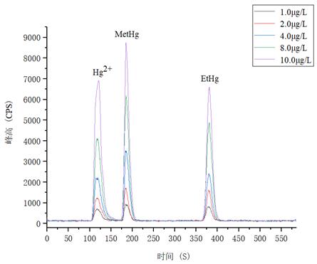 1.0μg/L、2.0.μg/L、4.0μg/L、8.0μg/L、10.0μg/L 汞形態(tài)混合標(biāo)準(zhǔn)溶液分離色圖譜如圖3所示,其中無機(jī)汞(Hg2+)、甲基汞(MetHg)、乙基汞(EtHg)相對(duì)保留時(shí)間分別為118s、185s、379s,從譜圖疊加圖上可以看出,三種汞形態(tài)出峰時(shí)間穩(wěn)定,且分離度較好。