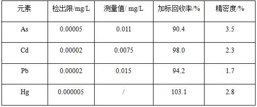 在碰撞反應(yīng)模式下,以內(nèi)標(biāo)法校正儀器信號(hào)漂移,將配制好的各元素標(biāo)準(zhǔn)溶液上機(jī)測(cè)試,繪制標(biāo)準(zhǔn)曲線,各元素標(biāo)準(zhǔn)工作曲線線性相關(guān)系數(shù)R>0.999;對(duì)樣品空白溶液平行測(cè)定11次,計(jì)算11次樣品空白值的標(biāo)準(zhǔn)偏差,并以三倍標(biāo)準(zhǔn)偏差/工作曲線斜率表示檢出限;間隔2min,對(duì)樣品平行測(cè)定7次,計(jì)算7次測(cè)試結(jié)果對(duì)應(yīng)的相對(duì)標(biāo)準(zhǔn)偏差,表示精密度;對(duì)樣品進(jìn)行加標(biāo)實(shí)驗(yàn),并計(jì)算加標(biāo)回收率。各元素檢出限為0.000005~0.00005mg/L,加標(biāo)回收率為90.4%~103.1%,精密度為1.7%~3.5%。
